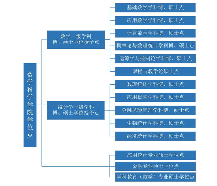 学院现有数学一级学科博、硕士学位授予点(下设基础数学、应用数学、计算数学、概率论与数理统计、运筹学与控制论、金融数学六个二级学科博、硕士点)和统计学一级学科博、硕士学位授予点(下设数理统计、应用概率、金融风险管理、生物统计、经济统计五个二级学科博、硕士点);应用统计、金融、学科教育(数学)三个专业硕士学位点。同时设有数学和统计学博士后科研流动站以及全国省属高校中唯一的国家理科基础科学研究和教学人才培养基地(数学),数学一级学科为江苏省重点序列学科,统计学一级学科为江苏省重点学科,数学与应用数学为“211”重点建设学科。