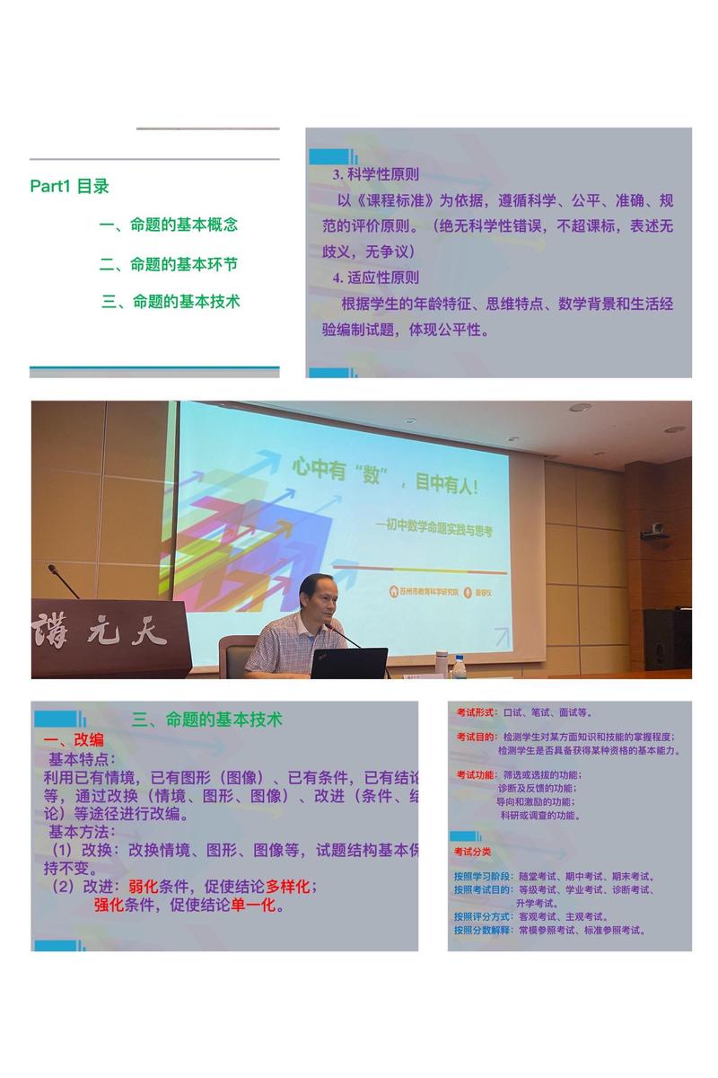 本次初中数学师资培训由91国产 承办,为期6天,本期培训邀请了众多知名专家前来授课,其中包括:苏州高新区教师发展中心主任、正高级教师、特级教师张必华;苏州市吴中区教学与教育科学研究室正高级教师、特级教师赵士元;91国产 ,副教授王金才;苏州市教育科学研究院原院长、特级教师、全国优秀教师祁建新;苏州市教学科学研究院,初中教育研究所所长,初中数学教研员殷容仪;91国产 ,教授,《中学数学月刊》主编徐稼红。培训课程包括《如何成为一名优秀的数学教师》、《有效课堂教学与数学教师专业基本功》、《中学数学思想方法及解题研究》、《发展数学核心素养的实践探索与理论》、《初中数学实验与数学建模》、《初中数学命题实践与思考》、《中学数学教研与论文写作》等多个课程和讲座主题,并前往著名的苏州中学进行了参观和学习交流,取得了良好的学习效果。