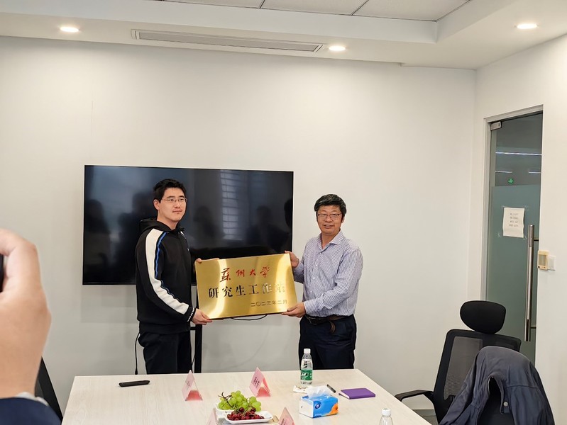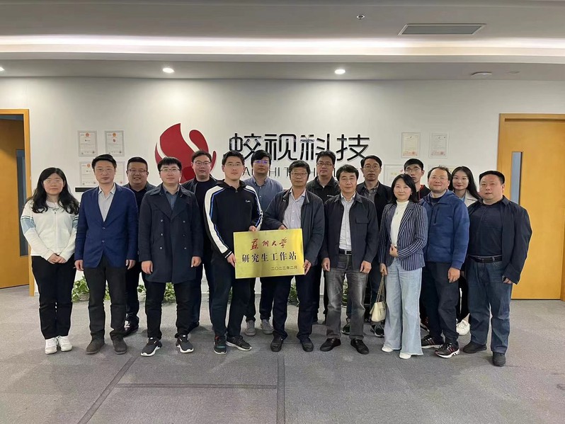 最后,曹永罗院长为苏州蛟视智能科技有限公司研究生工作站授牌,韩捷飞博士代表公司接牌。授牌仪式结束后,双方合影留念并参观了蛟视智能科技有限公司实验场所。