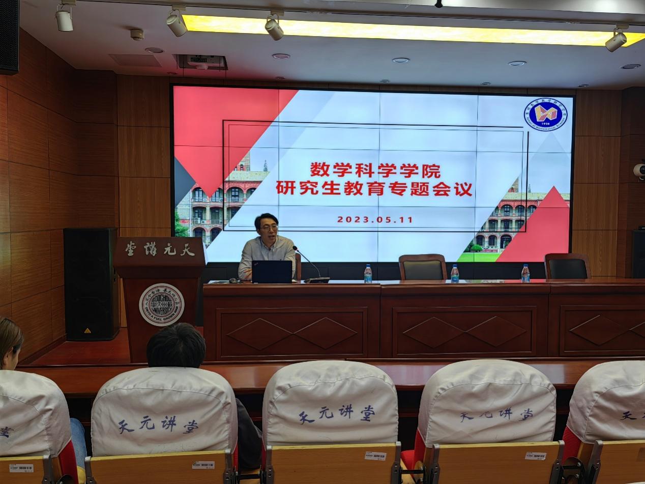为学习贯彻党的二十大精神,推动研究生思想教育工作的深入展开,2023年5月11日下午15:30,学院于天元讲堂开展了研究生思政教育专题会议。党委书记逢成华老师、教学院长王志国老师、学生工作办公室副主任尹伊老师、辅导员曾峥老师出席会议,数学专业、学科教学专业研究生们参与了本次会议。