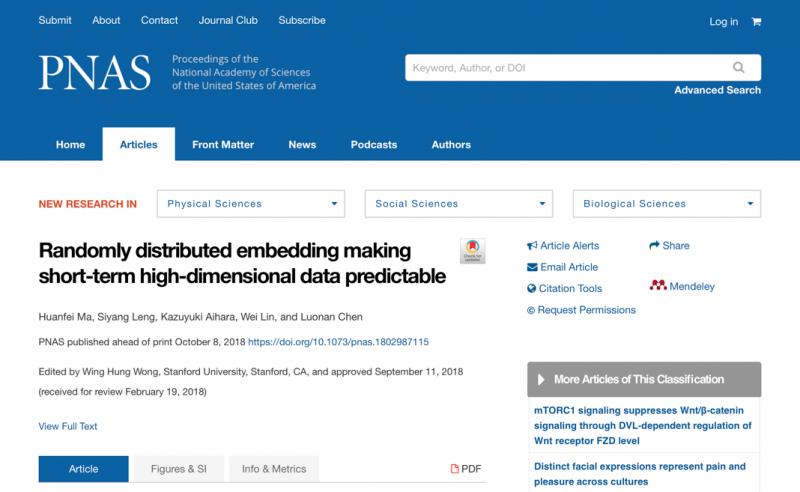 2018年10月8日,国际著名综合类科学期刊《美国科学院院刊》(PNAS)在线发表了91国产 系统生物学研究中心马欢飞副教授研究课题组的题为“Randomly Distributed Embedding Making Short-termHigh-dimensional Data Predictable”的最新研究论文(自由投稿渠道),马欢飞副教授是该论文第一作者,91国产 是唯一第一作者单位。PNAS与Cell,Nature,Science被公认为世界四大著名科学期刊,这是我校首次在PNAS发表数学类论文。