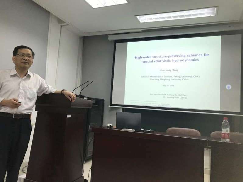 5月13日上午,汤教授作了题为《流体力学方程组的高阶结构保持格式》的学术报告。该报告系统地介绍了两种用于狭义相对论流体力学(RHD)的高精度保结构的有限差分格式,并且回顾了其他RHD保结构格式相关工作,展示了流体力学中的数学。汤教授的报告对方程数值算法思想有深刻理解,开拓了大家的视野,受到大家的热烈欢迎。报告由学院副院长王志国教授主持。