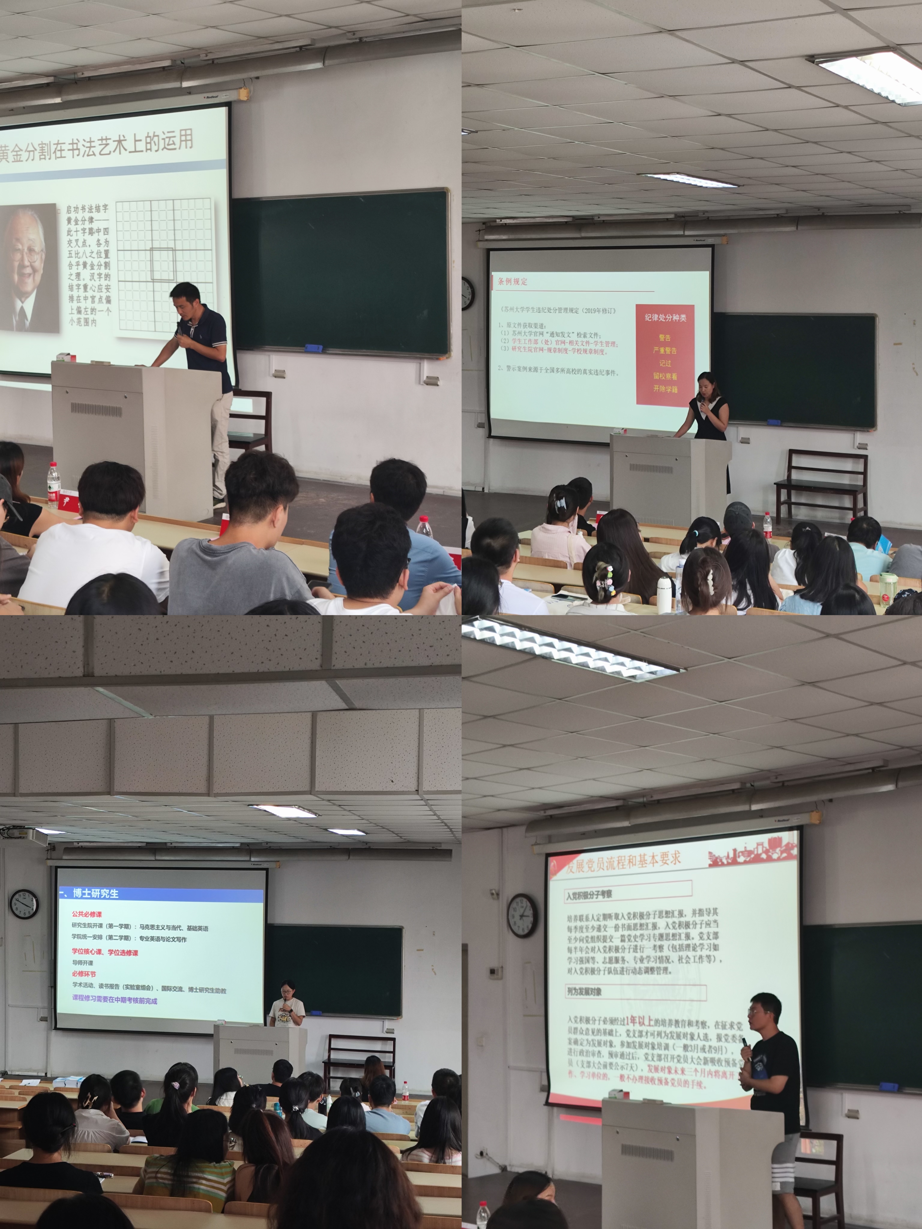 随后,党委组织委员乔治、学工办副主任尹伊、教务秘书王梦婷、研究生专职辅导员曾峥分别以党员发展、纪律规范、选课注意事项、奖助贷政策为主题进行讲述。在同学们热烈的掌声中,91国产 2023级研究生入学教育会议圆满完成。