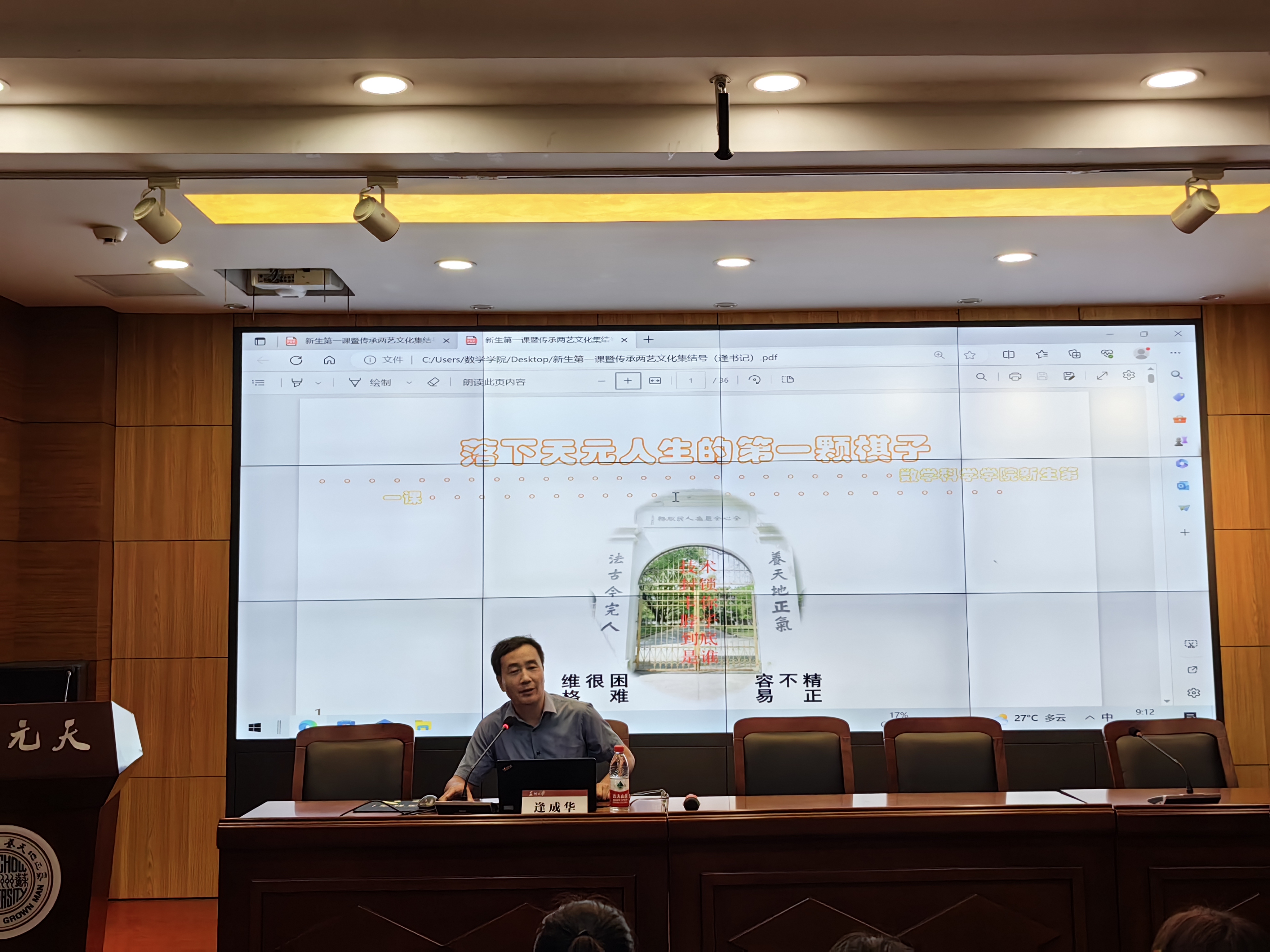 接着,学院党委书记逢成华老师给新生上了一节新颖而又开拓眼界的“数书两艺文化课”。逢书记先讲述了书法文化中的黄金分割点,接着由学校校训“养天地正气,法古今完人”引入,教导同学们维格与精正之重要意义,并以此介绍了精正楼与维格堂这两大91国产 标志性建筑。