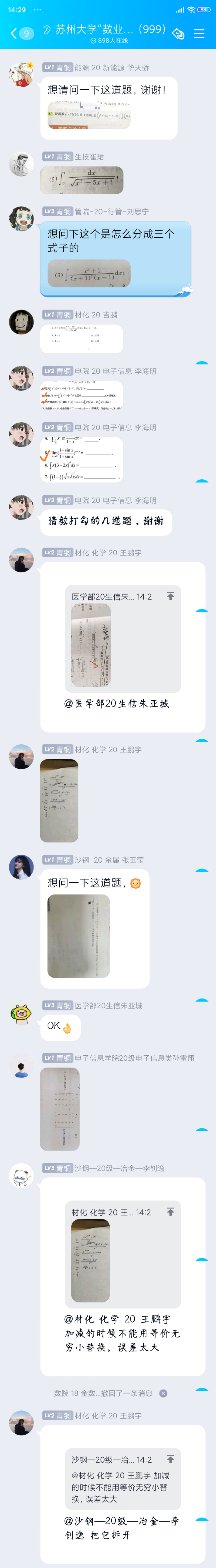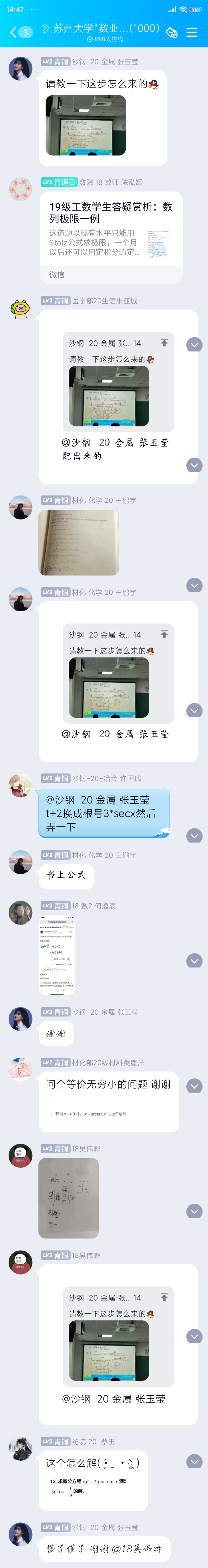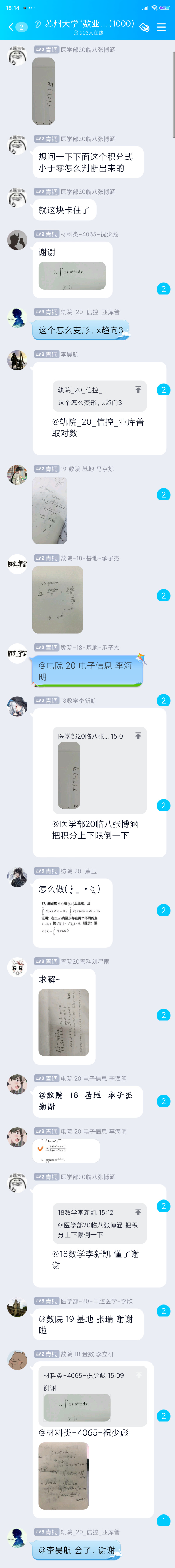 帮工团成员张海燕说:“一开始,我惊叹于qq群的学习氛围,没想到会有这么多同学加群并提问,还有同学相互帮助,各位帮工进行补充总结。”陈泓媛说:“我很高兴有此机会参与此次数业有帮工系列活动,既可以运用自己学习到的知识,突破时间、空间的限制,帮助高数有困难的同学,又可以与各位大佬进行线下交流,提升自己的知识水平,还能总结同学们高数问题的集中点,为该系列此后的活动提供素材。如果日后还有类似的活动,我一定会继续参加,可以用我自身的优势去帮助别人,同时对自己也有所帮助。”学习成员张玉莹说:“我感觉这个平台特别有帮助,来自不同学院、互相不认识的同学可以在这里互帮互助,数科院的同学特别负责,我提的问题都得到了耐心的解答,以后我还会继续学习,好好利用学校提供的学习平台。”