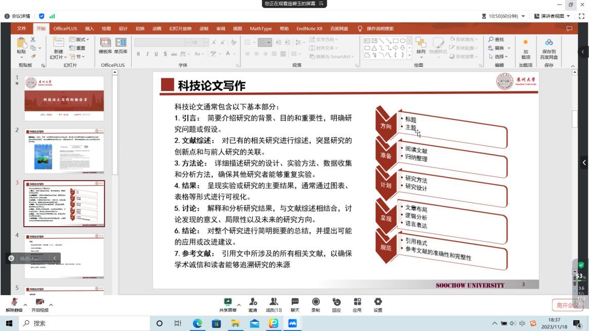 并且指出科技论文写作中的语言表达,参考文献的准确性和完整性,一篇论文的完成需要审慎写作,反复修改。在写作过程中,要多与导师和朋辈交流,碰撞思想火花,汲取科研养分。另外,论文写作是个耗时较长且磨练意志的过程,要不断给自己信心,坚定科研目标并为之不懈努力。