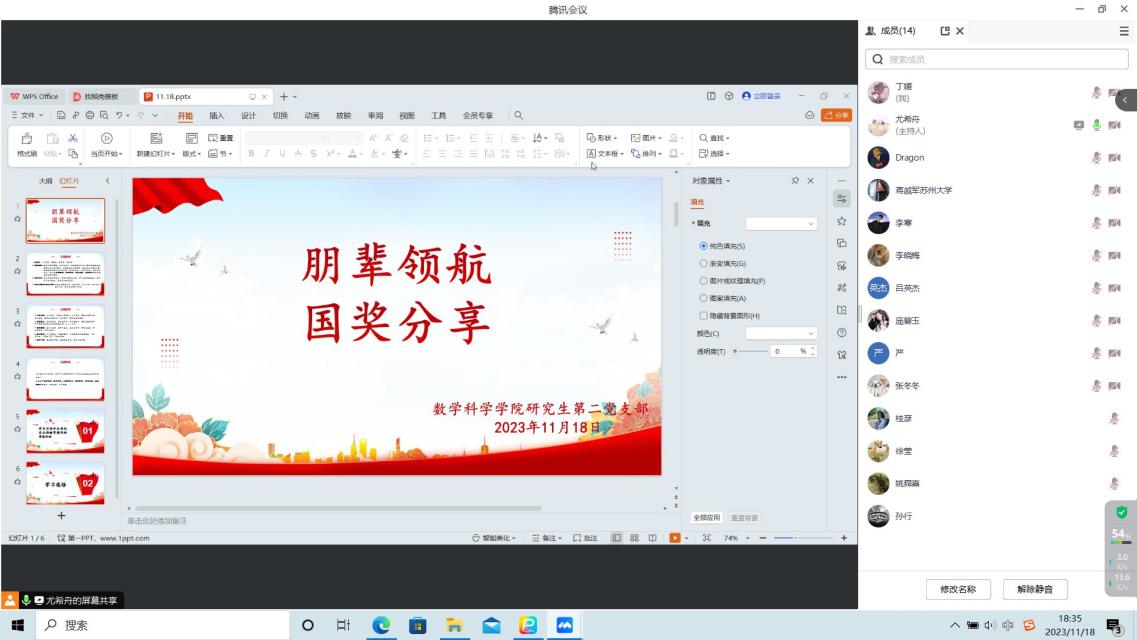 正值毕业生们为毕业论文奋战之时,为更好的服务同学们的科研生活,研究生第二党支部于2023年11月18日举办了“朋辈领航,国奖分享”党日活动,邀请优秀党员同学以及国奖获得者分享科研论文写作的经验和感想。鉴于部分同学在外实习,活动形式为线上分享交流,全体研究生党员参加此次会议。