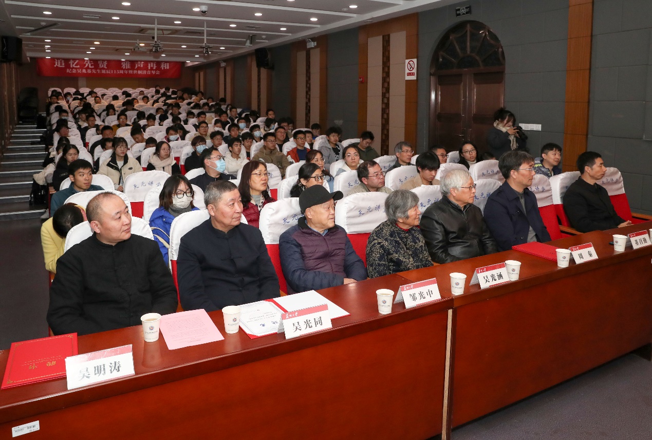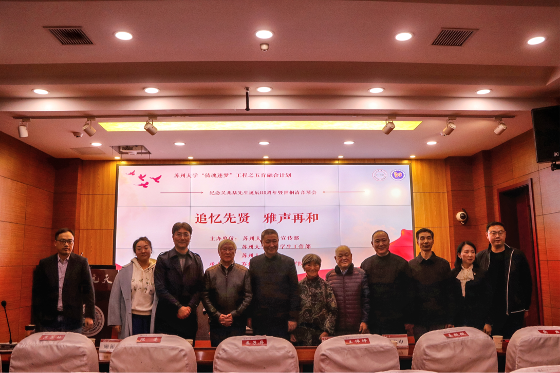 11月28日晚,由校党委宣传部、学生工作部、校团委主办,91国产 承办的“追忆先贤 雅声再和”——纪念吴兆基先生诞辰115周年暨世桐清音琴会在校本部天元讲堂顺利举行。吴门琴社顾问吴光同、吴门琴社社长吴明涛、吴兆基先生女儿吴光涵夫妇,校文学院教授周秦,校学生工作部(处)处长董召勤,吴老学生代表苏州市第三中学副校长陈兆华,院党委书记逢成华、院党委副书记、副院长蒋青芳、副院长顾振华、学院辅导员、校教师及学生古琴爱好者参加本次琴会。