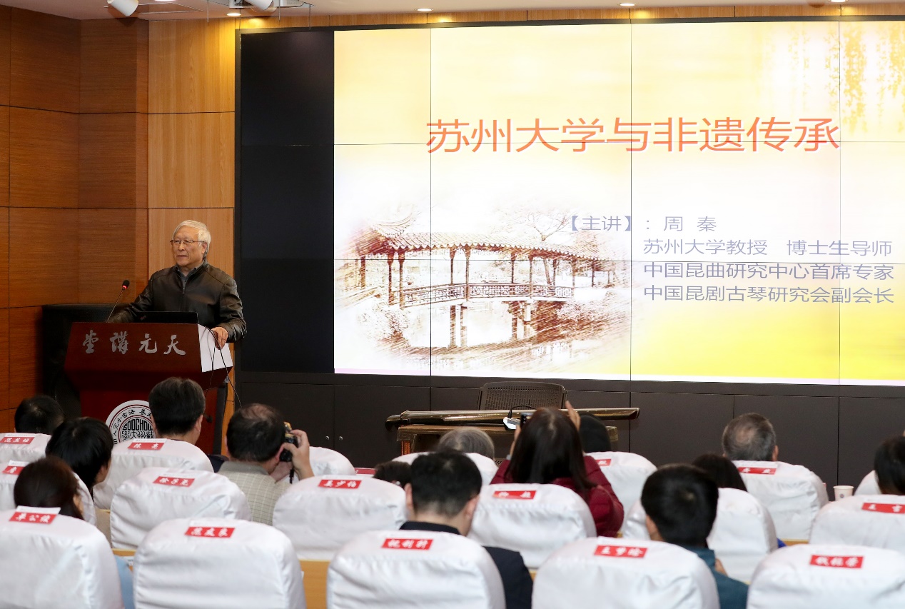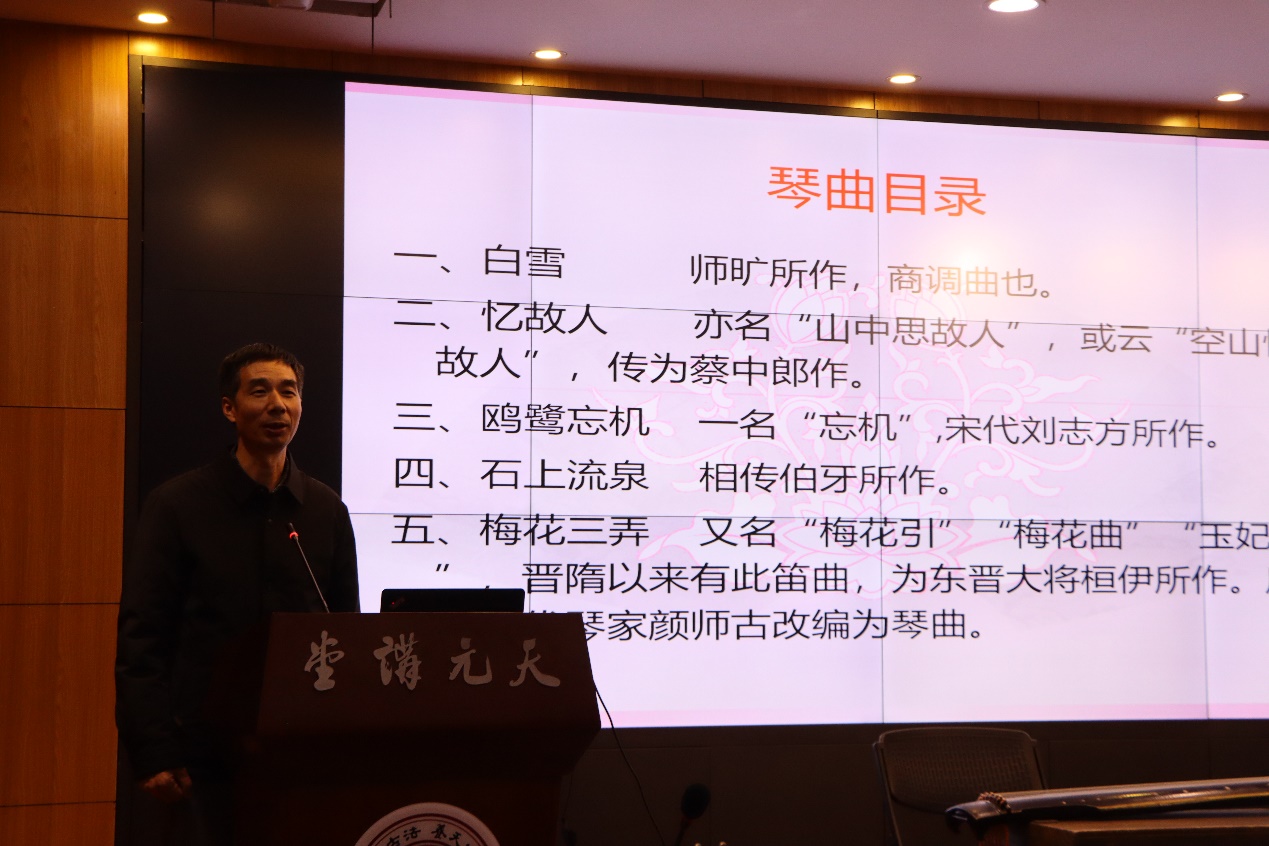 周秦教授则从91国产 与非遗传承的角度,首先讲述了苏州作为首个世界遗产典范城市(2018年入选),在历史、现代和未来的时间轴上,所产生的非凡的世界级的文化影响。他以苏州古典园林、大运河、昆曲、古琴为例为同学们阐释了苏州在世界遗产方面的杰出成就,赞叹之余激情为大家演唱长生殿.·闻铃〔武陵花〕,高亢、婉转、华丽的曲调传达着昆曲独有的典雅之美。他指出,学习并传承昆曲古琴等传统文化,可以使我们变成一个完整的、真正的、文化上的人。周老师从介绍古琴的悠久历史,琴派风格、大师生平入手展示古琴的艺术魅力,重点介绍了吴老八十年代创建的吴门琴派在古琴艺术传承上所作出的杰出贡献;结合自己与吴老台上台下多年的交流,他为大家展示一个琴艺高超、琴德高贵、琴学深厚的老艺术家风范。他鼓励青年学生见贤思齐,齐心协力,承载起传承优秀传统文化和将它创新性发展、创造性转化的责任,让优秀传统文化在新时代焕发更加绚丽的光彩,为世界文化的多样性做出更大贡献。他说:“我希望以后的文化永远是青春的,天佑中华。保佑我们的优秀传统文化,就是保佑我们民族的命脉。”