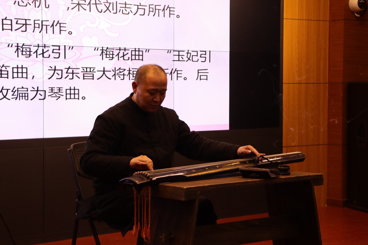 吴明涛先生作为吴门琴派的传人,带来了传家宝——一张千年唐琴“玉玲珑”。他感慨“琴可以传千年,而人不过百年。所以每一位琴人对于琴来说,琴才是时间的主人,我们都是过客而已。这张琴在千年前可能就预见了今天会和大家相遇,所以它等了大家一千年。”带着对祖父深情的怀念,他弹奏起了《忆故人》、《梅花三弄》和《石上流泉》,吴光同先生弹奏了《鸥鹭忘机》和《白雪》,每一首古琴弹奏之前,吴明涛社长都为大家讲解曲目作者、创作背景、情怀意境……琴音醉明月,雅韵会知音。古琴悠扬,轻盈而又深邃,弹指间,仿佛在诉说着从古至今的温良、光明和坚韧,他们以这些穿越千年的琴音回应了周秦教授的主旨演讲。同学们沉浸在琴声中,身临其境地感受着古人对美的追求和对人生的沉思,与其说欣赏着高雅音乐,更是瞻仰着一个个高贵的人格。