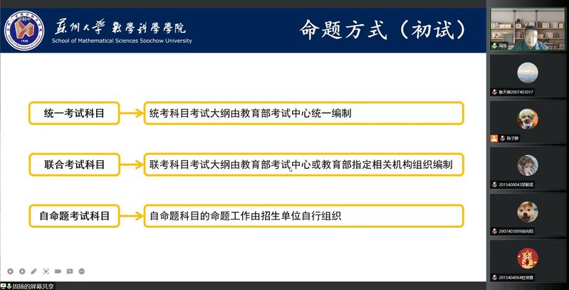 周老师给同学们介绍了数科院各专业的考研方向。数科院各专业都可以往数学方向深造,包括数学、基础数学、计算数学、概率论与数理统计、应用数学、运筹学与控制论等;信息与计算科学还可以往计算机科学与技术、计算机系统结构、计算机软件与理论、计算机应用技术和电子信息等方向发展;师范对口的专业为学科教学;金融数学的发展方向最多,理论经济学、应用经济学、金融等大类都可以考虑。同学们应根据自己的职业规划和学习能力,选择合适的院校和专业,不可盲目跟风。