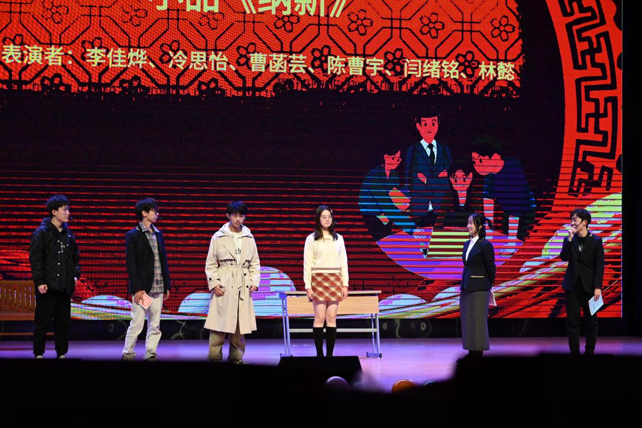 由李佳烨、冷思怡、曹菡芸、陈曹宇、闫绪铭、林懿同学带来的小品《纳新》,把新生对大学生活片段的独特理解和感悟诙谐地表达了出来,嬉笑怒骂,独特新颖,勾起了大家对初入校园努力融入社团的回忆和思考。
