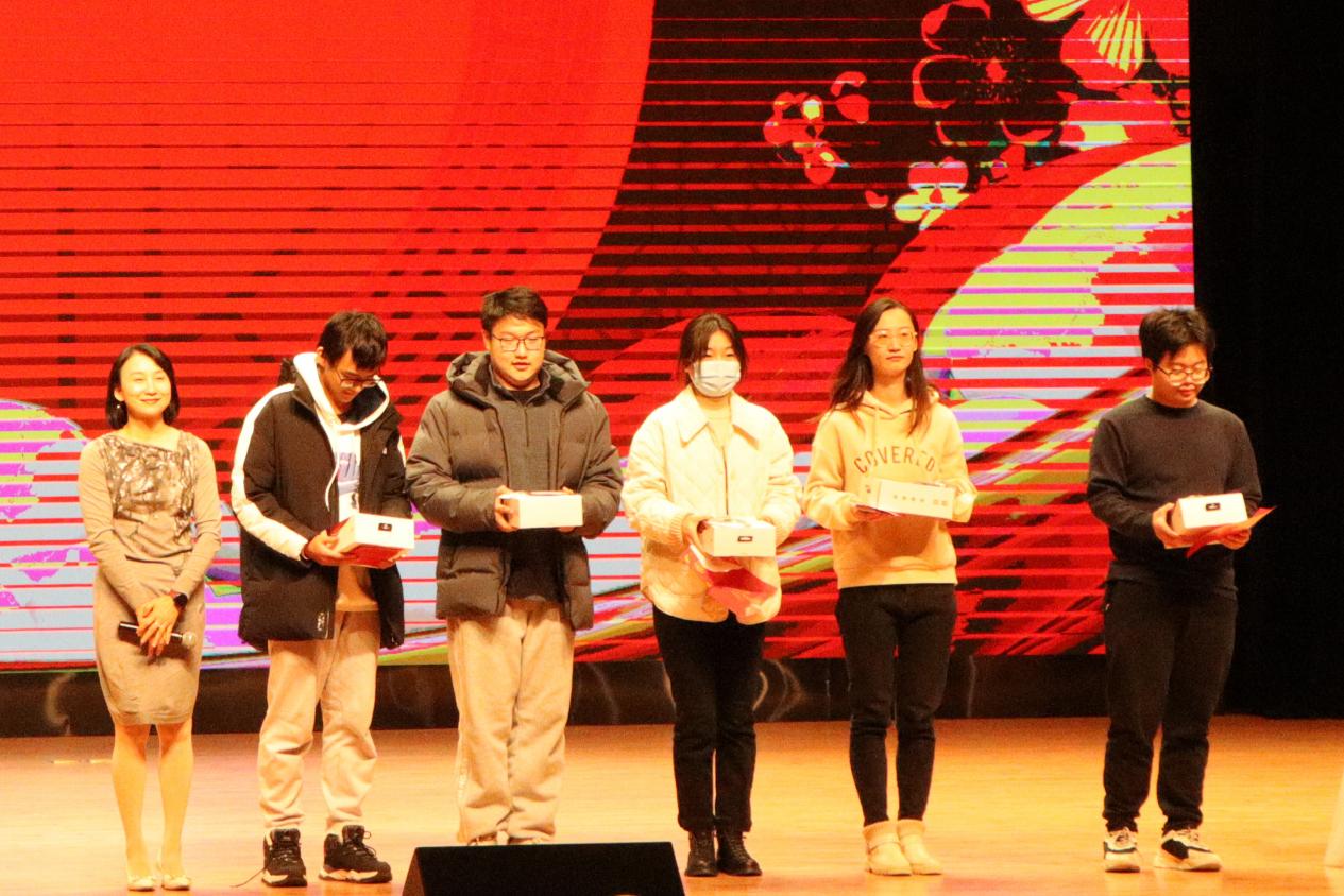 晚会首轮抽奖如约而至,台下观众们激动紧张。副院长王志国老师在观众之中抽取了五名幸运观众,同时也为向全体师生送上了祝福。