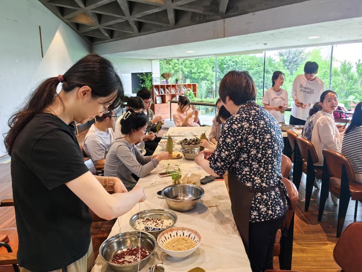 村上长漾里,犹如一幅掩映在江南山水中的、静谧的田园画卷。包粽子环节,晶莹的糯米,甘甜的蜜饯,翠绿的粽叶……小巧的粽子在同学们手忙脚乱的动作之间终于成型。随后,我们走向田间,体验插秧的乐趣。脚下的泥土柔软湿润,插下的秧苗如同希望的种子,迎风摇曳,满怀生机。午后,蒋老师带我们学习了二十四节气的知识。蒋老师讲述着每一个节气背后的故事和文化内涵,让我们对自然的变化有了更深的理解。随后,我们品茶论道,滋润心田。虽然对茶艺一知半解,但茶香沁入心脾,我的内心竟也十分满足。这个端午节,在村上长漾里,我们找到了人与自然和谐共处的美妙感觉,找到了心灵的宁静与安详,更感受到了学院的用心。