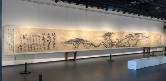 随后大家均被一幅12米长的水墨画吸引,这幅画是刘海粟先生的巨幅水墨画《清奇古怪》。刘海粟一生重视书法,以书入画是其重要的创作理念。他的书法厚重雄肆,与其国画精神一脉相连,都注重中锋用笔,倡导情感的生发,所有的笔法、章法都服从磅礴的感情需要,作品气势雄浑。在创作这幅画时,刘老先生已经90多岁高龄,画作展现了刘海粟先生挑战自我和不服老的精神。