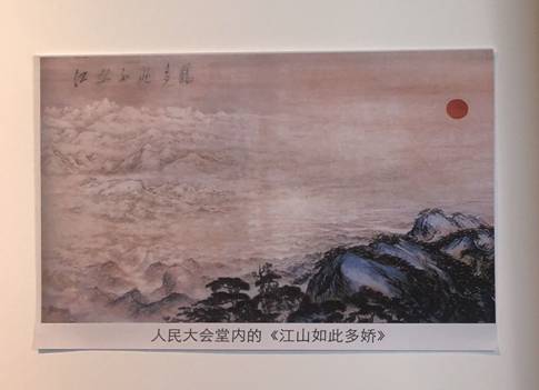 党员们观看了宣传视频,之后跟随着解说员开始欣赏画作。首先参观了国画巨制《江山如此多娇》。这幅画由金陵画派领袖、江苏国画院院长傅抱石和岭南画派的代表人物关山月两位先生共同完成。将我们伟大祖国的山河风貌表现得气势磅礴又妩媚多娇:近景是江南青绿山川、苍松翠石;远景是白雪皑皑的北国风光;中景是连接南北的原野,而长江和黄河则贯穿了整个画面。画上还有一轮红太阳,体现出“东方红,太阳升”之意、也象征着共产党带领着祖国蒸蒸日上,展现了伟大祖国的繁荣昌盛。