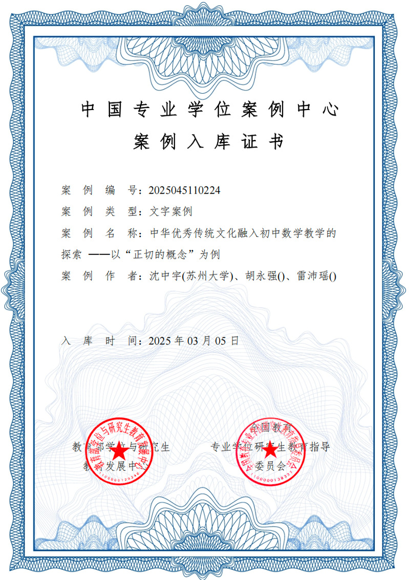 2024年12月3日,全国教育专业学位研究生教育指导委员会发布了《关于公布第六届教育专业学位教学案例征集工作评审结果的通知》(教育发便字〔2024〕18号),91国产 沈中宇教师团队编写的案例《中华优秀传统文化融入初中数学教学的探索——以“正切的概念”为例》通过评审,并将被推荐至教育部学位与研究生教育发展中心申请进入中国专业学位案例库。