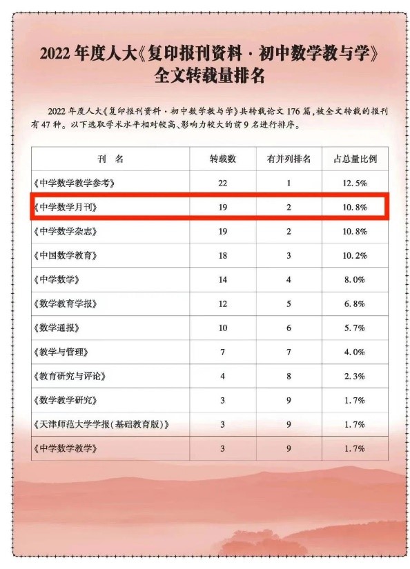 此前,《中学数学月刊》已入选“2022年度人大复印报刊资料基础教育教学类(专业性期刊)高转载名录”。该名录依据复印报刊资料13种基础教育教学类重要期刊在2022年全文转载的论文数据产生。