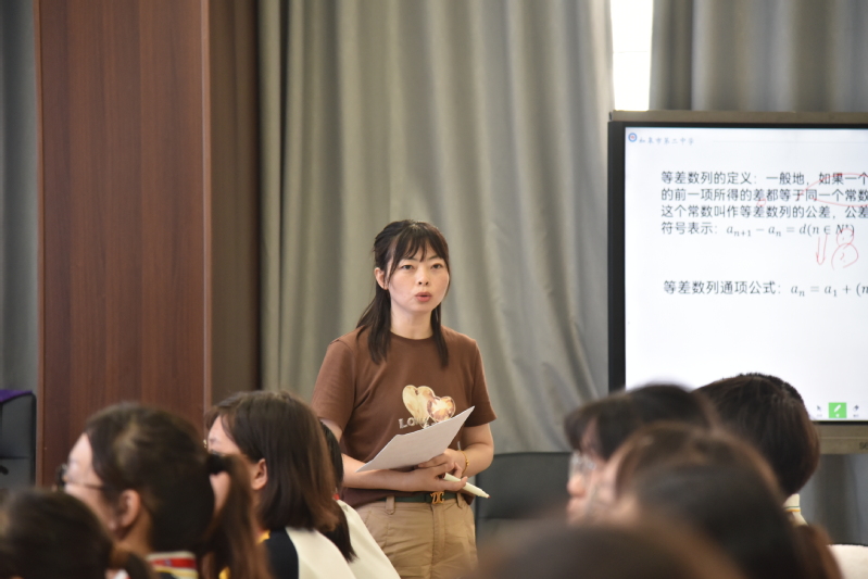 接着,由如皋市第二中学黄荣老师以“等比数列的概念及通项公式”为主题进行教学展示,黄老师通过生动形象地讲解当地特色美食“脆饼”的制作过程,让学生对等比数列的概念有一个初步的认识,并通过类比等差数列的定义方式和通项公式给出等比数列的概念和通项公式的定义,达到了寓教于乐的效果。两位老师都取得了良好的教学效果,起到了较好的学科示范作用。