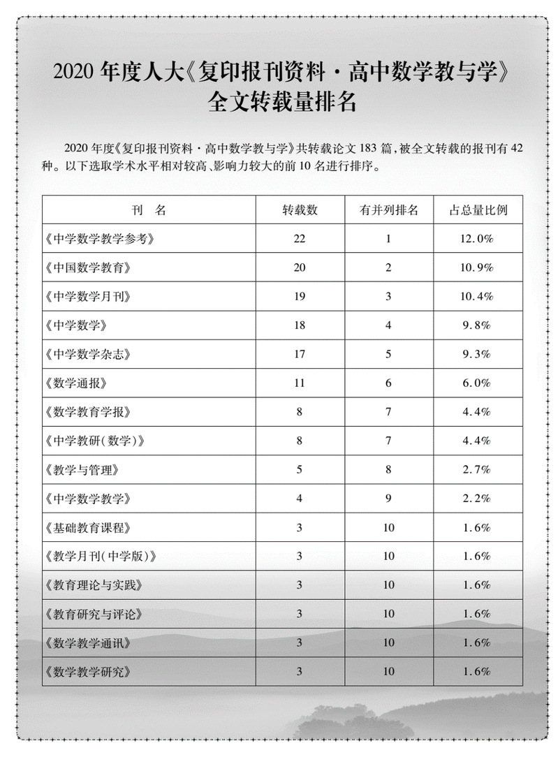 人大复印报刊资料基础教育系列刊物主要面向中学教师、教研员、教育管理者和高校的高年级学生和研究生,该系列刊物中的文章从近千种公开出版物遴选出来。文章能否被该系列刊物转载,是衡量文章质量的重要尺度。而被转载文章的数量,则是教育类期刊质量评估的重要指标之一。